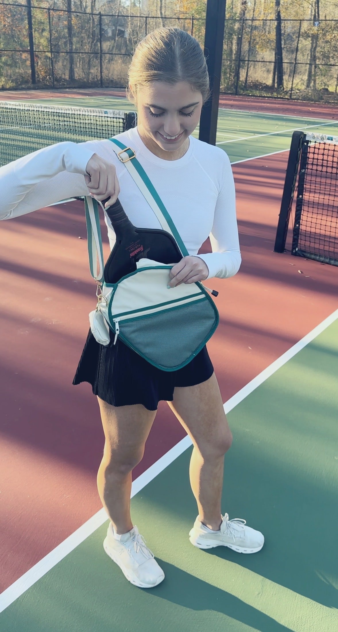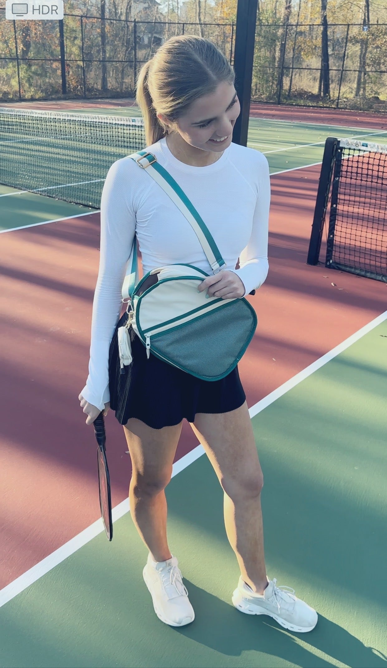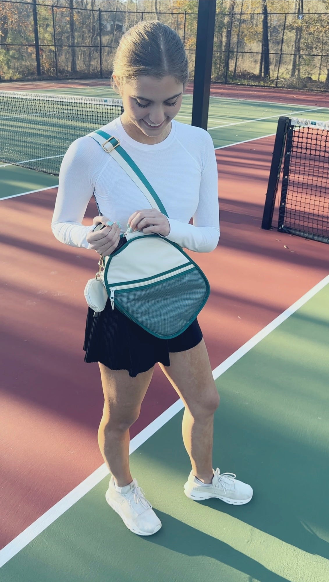 Show up to the courts in style with this preppy green and white crossbody bag. Perfectly sized at 9.5" x 2.4" x 13.4", with an additional 3" x 3" small bag, adjustable and attachable strap, and zipper closure. Keep your essentials secure in the outside zipper pocket. Dink it!